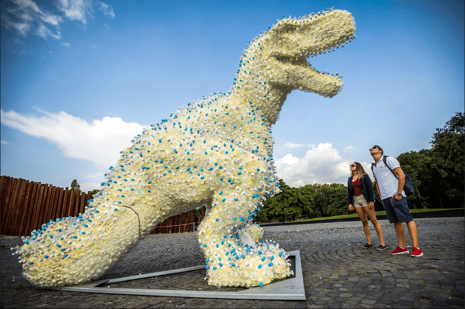 A 9. Art Moments kortárs vizuális művészeti fesztivál keretében az Ötvenhatosok terén állították fel a PET palackokból épített, négy méter magas dinoszauruszszobor.