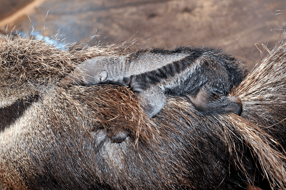 Egy kétnapos sörényes hangyász (Myrmecophaga tridactyla) kapaszkodik anyjába, Isabelába a Fővárosi Állat- és Növénykertben MTI Fotó: Kovács Attila.