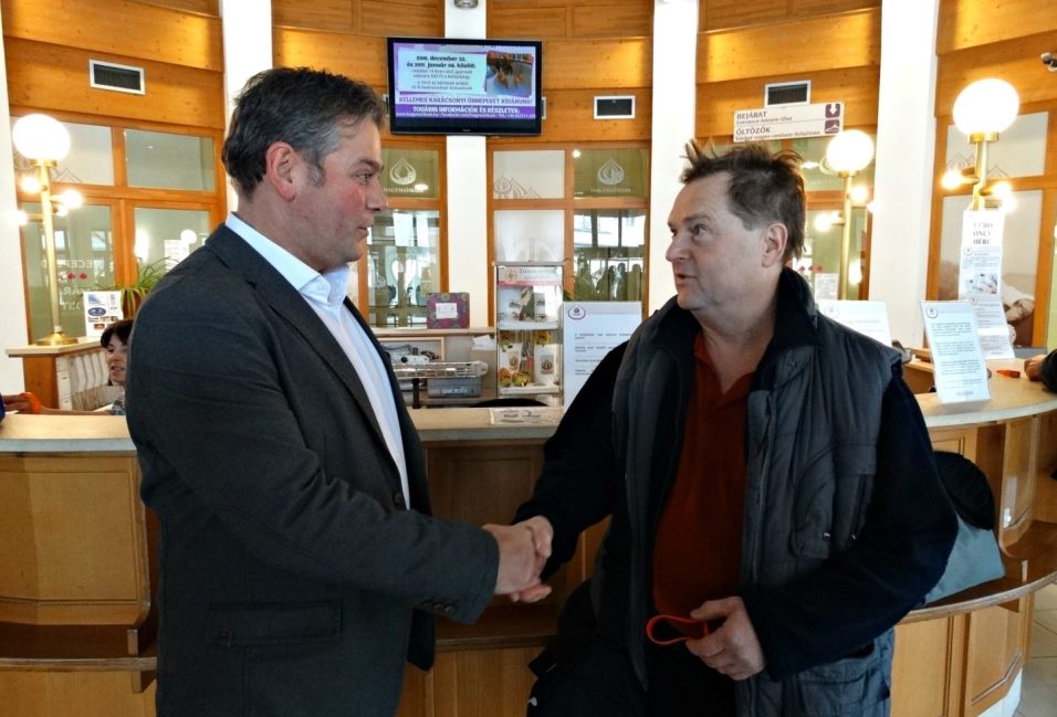 Gergely Gábor ajándékcsomaggal köszöntötte ma délelőtt a makói Pálhidai Lászlót, a Hagymatikum Gyógyfürdő kétmilliomodik látogatóját.