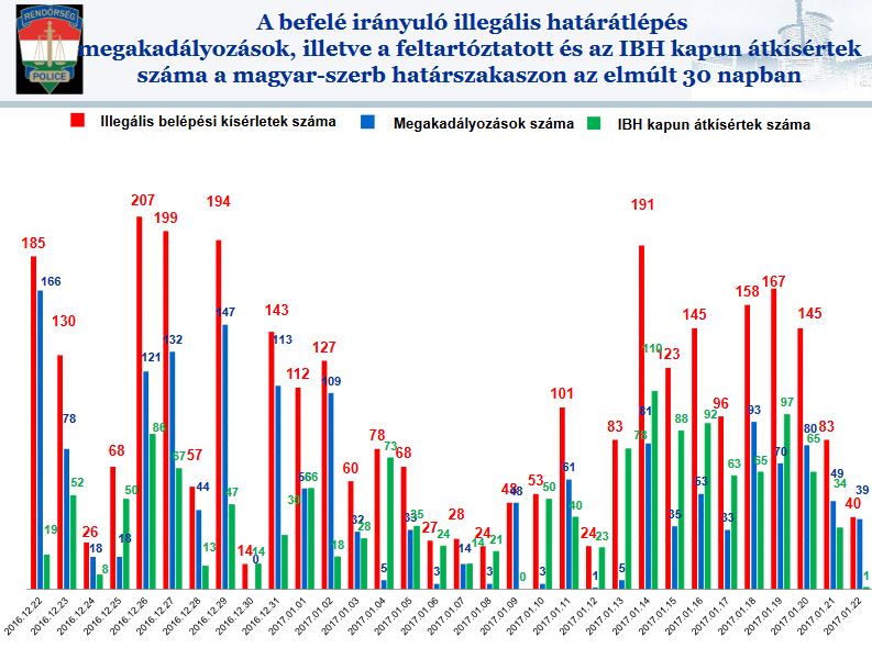 A rendőrök és a katonák 168 főt megakadályoztak az ország területére történő illegális belépésben, 100 főt feltartóztattak és átkísértek az ideiglenes biztonsági határzáron. Magyarország területén 9 fő határsértőt fogtak el a rendőrök, továbbá 1 fővel szemben közokirat-hamisítás miatt indítottak büntetőeljárást – közölte az Országos Rendőr-főkapitányság.