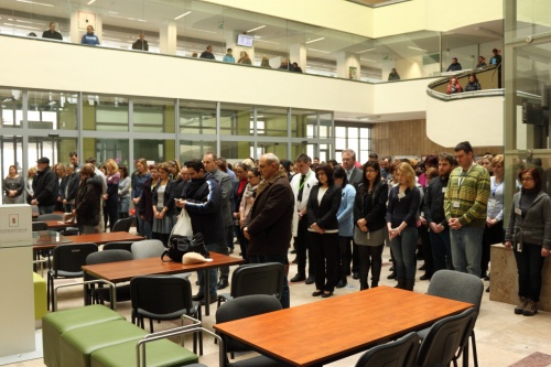 A nemzeti gyásznapon kihelyeztük a gyászlobogót, és most arra kérünk mindenkit, aki az épületben van, hogy egy perces néma főhajtással emlékezzünk az áldozatokra! Így fejezzük ki együttérzésünket az elhunytak hozzátartozóival.