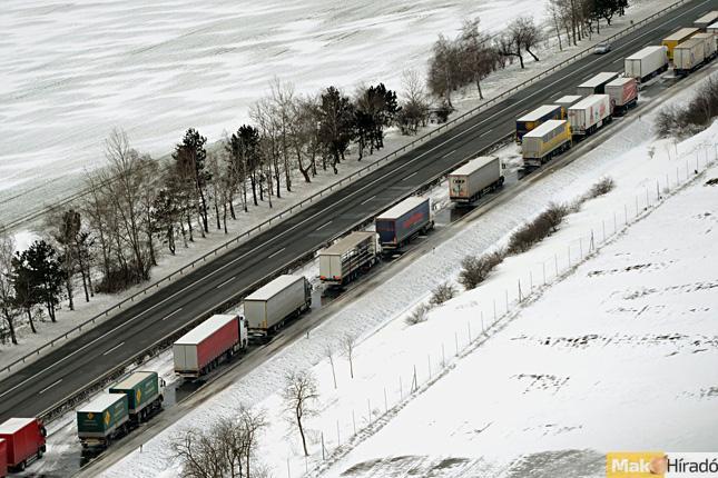 Két óra várakozásra kényszerülnek a kilépésre váró teherautók az M43-as autópálya csanádpalotai határátkelőnél.