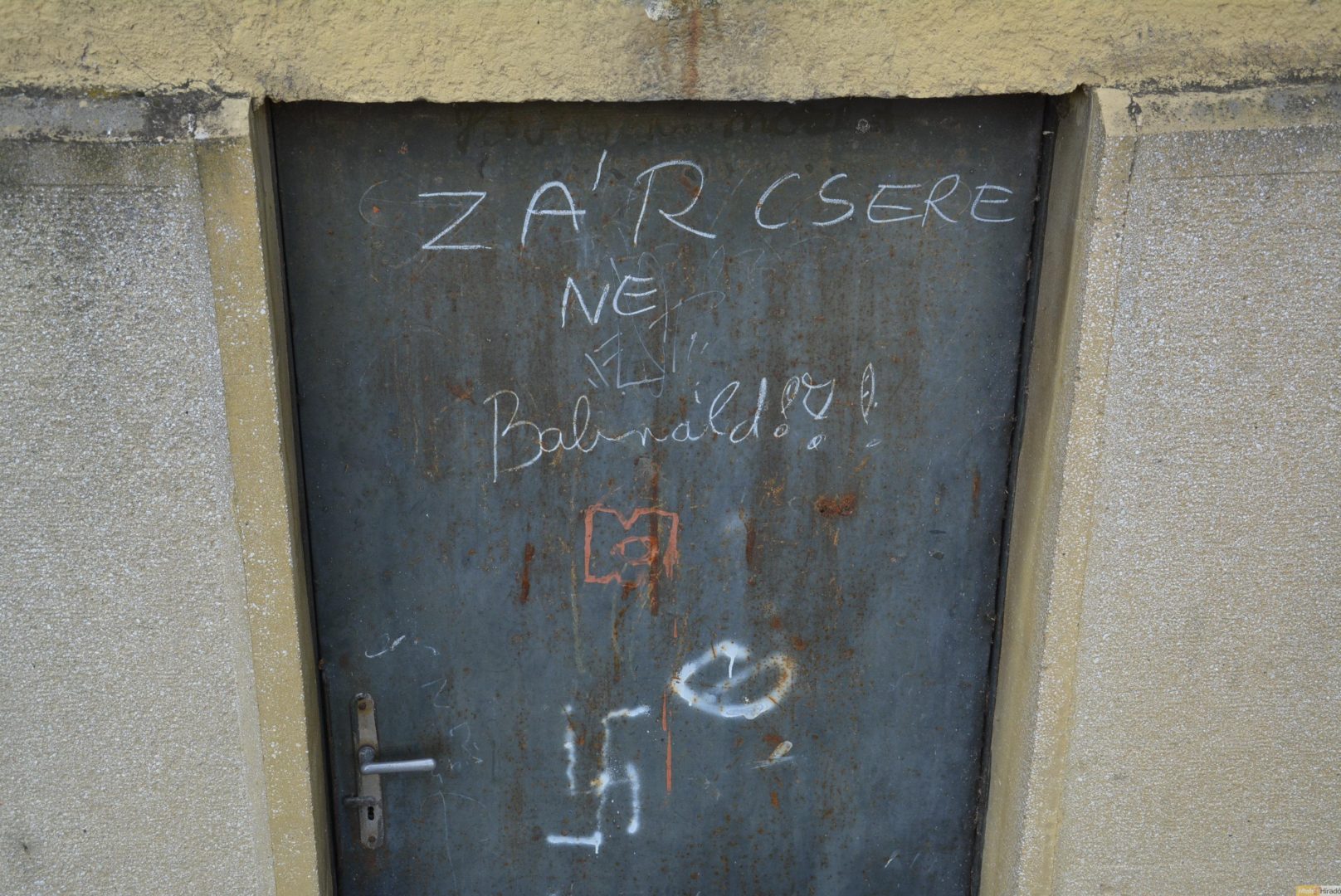 Szintén erre, azaz a Hagymatikum kültéri medence felőli részére néz az a pinceajtó, melyen a zárcserével kapcsolatos felirat alatt egy horogkereszt is látható.