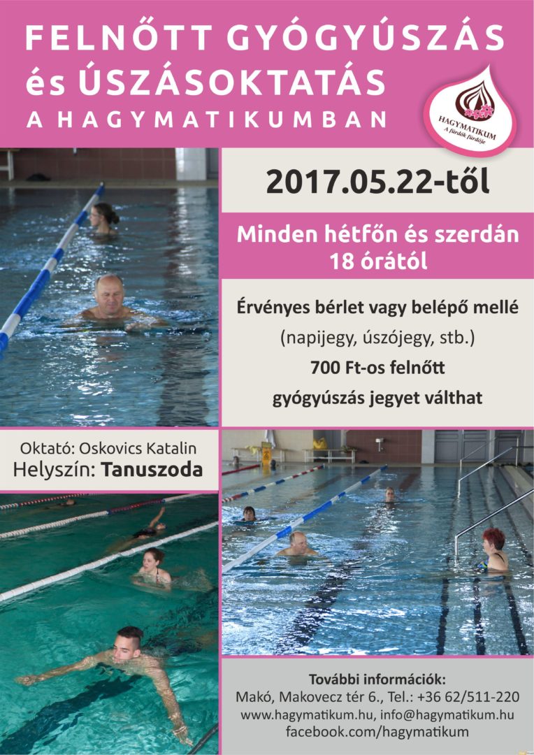 Nem tud úszni, vagy éppen tud, de az orvosa szt mondta, hogy úsznia kellene? Hát nem kell csak ezért Hajdúszoboszlóra, Hévízre vagy Kehidakustyánba, Miskolctapolcára vagy a Nyíregyháza melletti Sóstórautaznia. Felnőtt gyógyúszáson Makón, a tanuszodában is részt vehet, minden hétfőn és szerdán délután 6-tól. Oskovics Katalin irányításával bárki enyhítheti fájdalmait a vízben mozogva, s aki nem tud úszni, az ugyanott, ugyanakkor akár meg is tanulhat.
