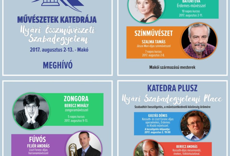 A Makói Nyári Összművészeti Szabadegyetem 2017. augusztus 2. és 13. között nem csupán a fiatal résztvevőknek jelenthet élményt, hanem a makói művészetszerető közönség számára is, a Katedra Plusz révén. Ezzel a szabadtéri beszélgetéssel nyitja és zárja kapuit a képzés. Nyitásként augusztus 2-án, este 7-kor Gulyás Dénes, Kossuth- és Liszt Ferenc-díjas operaénekes, Érdemes és Kiváló művésszel, zárásként, augusztus 11-én este 7-kor Berecz András Kossuth-díjas mesemondó, énekes, folklórkutatóval beszélget Bátori Éva, a Művészetek Katedrája művészeti vezetője a Korona földszinti teraszán, azaz Nyári Szabadegyetemi Placcon.