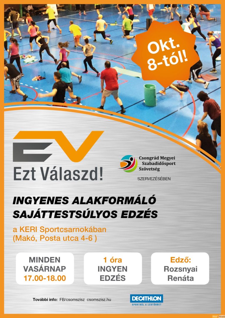 Ingyenes edzéseket rendeznek október 8-ától Ezt válaszd! címmel a Návay iskola tornacsarnokában a Csongrád Megyei Szabadidősport Szövetség programsorozata részeként.