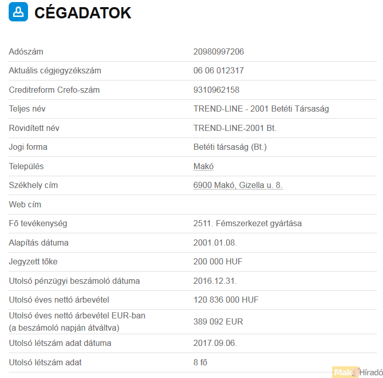 Azaz egészen pontosan 7 millió 49 ezer forintot nyert a városban leginkább a vasmanókról ismert Trend-Line 2001 Bt. kapacitásbővítésre egy GINOP pályázaton. Makóról egyébként más cég nem nyert.