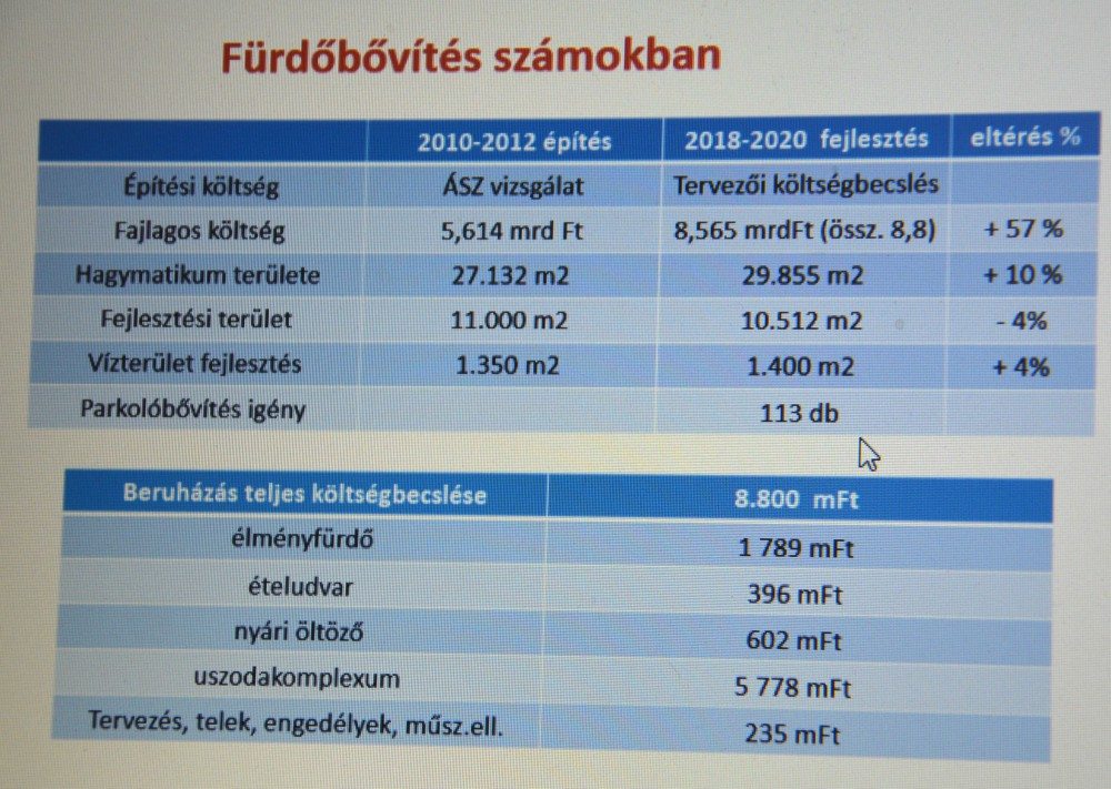 A könyvtár tervezése nettó 146 millió 550 ezer, azaz bruttó 186 millió 118 ezer 500 forintba, míg a fürdőbővítésé nettó 86 millió 870 ezer, azaz bruttó 110 millió 324 ezer 900 forintba, azaz összesen bruttó 296 millió 443 ezer 400 forintba került. Egyébként a tervezés költségeinek fedezetére a kormány biztosított 300 millió forintot.