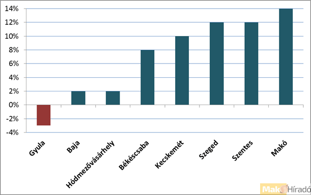 Az eltérések nemcsak az egyes régiók között, hanem azokon belül is tetten érhetőek, ami Dél-Alföldön ugyancsak megmutatkozik. Idén január és szeptember között Gyulán 3%-kal visszaestek, Baján, Hódmezővásárhelyen kismértékben, mindössze 2%-kal bővültek az átlagos négyzetméterenkénti árak. Ezeken az adatokon lényegesen túlmutattak a változások Szegeden, Szentesen, valamint Makón, ahol 12-14%-os drágulás érvényesült az időszakban.