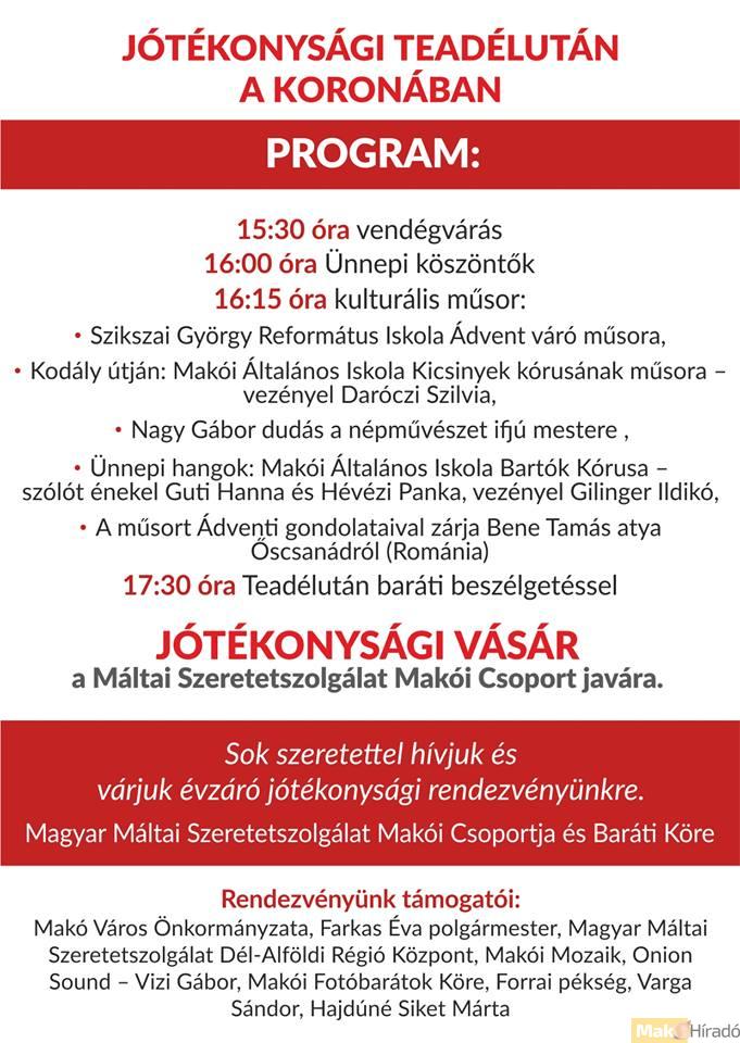 Jótékonysági teadélutánt rendez a Magyar Máltai Szeretetszolgálat makói csoportja vasárnap délután 4 órától a Korona szállóban. A kép a tavalyi rendezvényen készült.