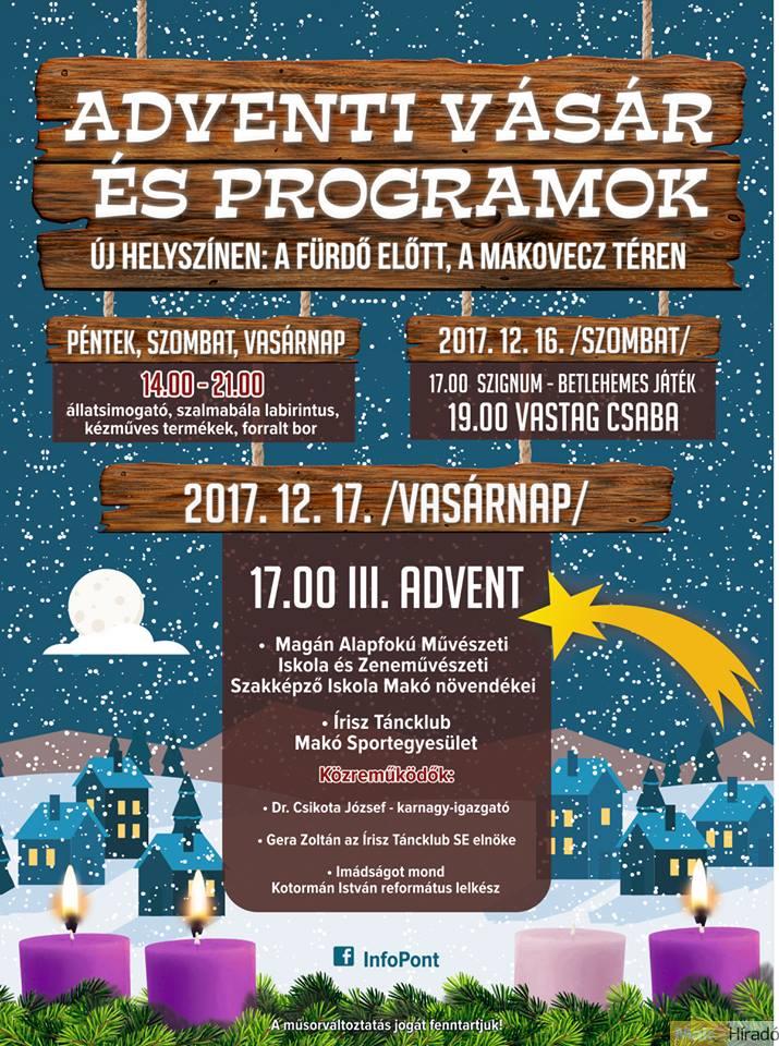 December 16-án, szombaton a SZIGNUM-Betlehemes játéka után 19 órától Vastag Csaba lép fel a Hagymatikum előtti Adventi vásárban. A harmadik gyertyát vasárnap 17 órakor gyújtják meg, ekkor a Magán Alapfokú Művészeti Iskola és Zeneművészeti Szakképző Iskola Makó növendékei és az Írisz Táncklub szórakoztatja majd a kilátogatókat.