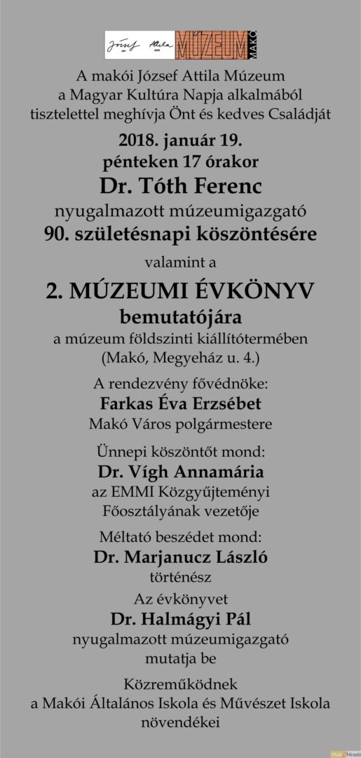 Tóth Ferenc nyugalmazott múzeumigazgatót köszöntik 90. születésnapja alkalmából illetve bemutatják a 2. múzeumi évkönyvet is Makón, a Magyar Kultúra Napja alkalmából.