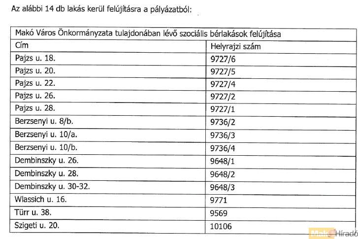 A közbeszerzési pályázatban szereplő felújításra váró lakások: Berzsenyi utca 8/b., Berzsenyi utca 10/a., Berzsenyi utca 10/b., Dembinszky utca 26., Dembinszky utca 28., Dembinszky utca 30., Paizs utca 18., Paizs utca 20, Paizs utca 22., Paizs utca 26., Paizs utca 28., Szigeti utca 20., Türr utca 38. valamint a Wlassich utca 16.