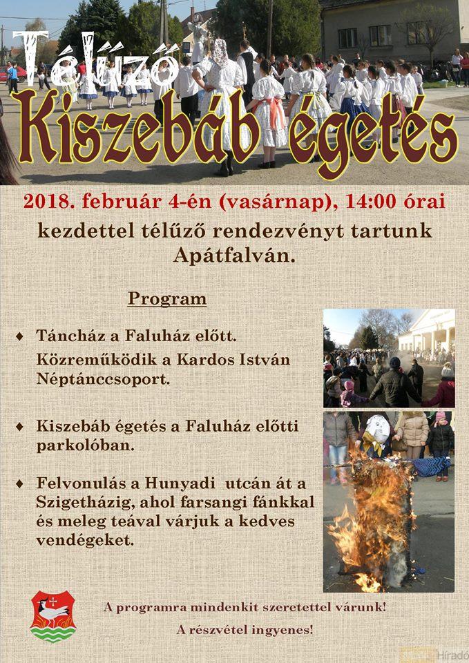 Szeretettel várnak minden érdeklődőt február negyedikén, vasárnap Apátfalván télűző kiszebáb-égetésre, amelyet a Faluház előtt rendeznek meg. Az esemény 14 órakor kezdődik, teával és fánkkal is várják a vendégeket. Borító: MTI Fotó – Sóki Tamás