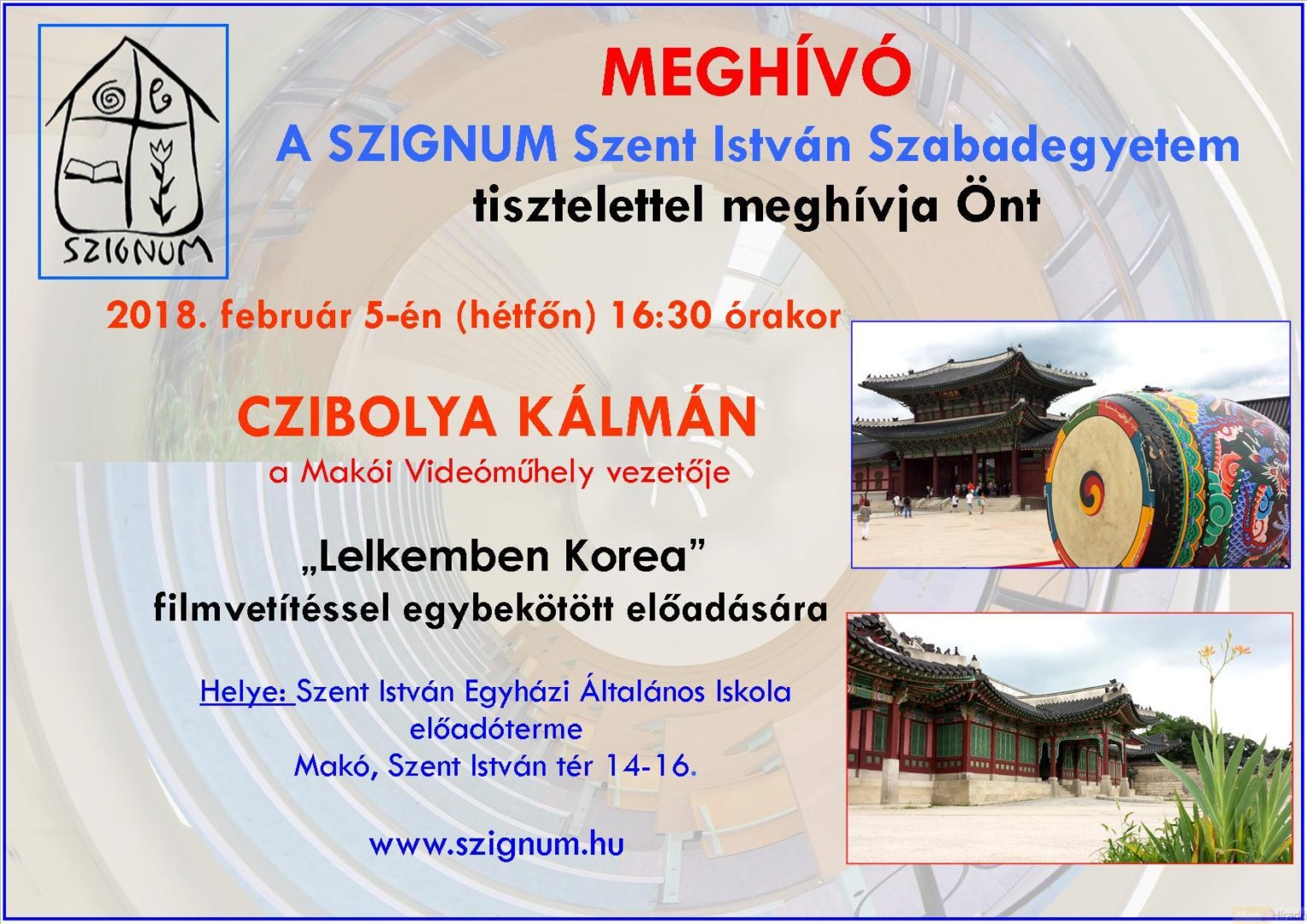 Lelkemben Korea címmel tart filmvetítéssel egybekötött előadást Czibolya Kálmán a Makói Videóműhely vezetője február ötödikén hétfőn 16:30 órai kezdettel a SZIGNUM Szent István Szabadegyetemén.