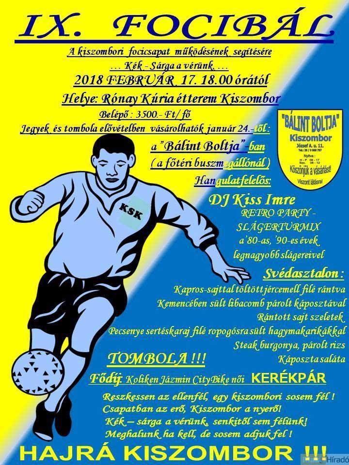 Kilencedik alkalommal rendez jótékonysági bált a kiszombori focicsapat. Az est bevételéből a sportklub működését finanszírozzák. A svédasztalos vacsorát követően DJ Kiss Imre szolgáltatja a ’80-as és ’90-es évek legjobb slágereit.