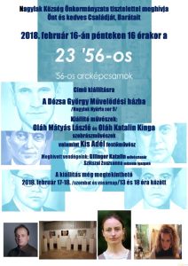 23 ’56-os címmel nyílik kiállítás pénteken a nagylaki Dózsa György Művelődési Házban. A kiállító művészek: Oláh Mátyás László és Oláh Katalin Kinga szobrászművészek, valamint Kis Adél festőművész. A megnyitó meghívott vendégei Gilinger Katalin művésztanár, és Szikszai Zsuzsanna múzeumigazgató.