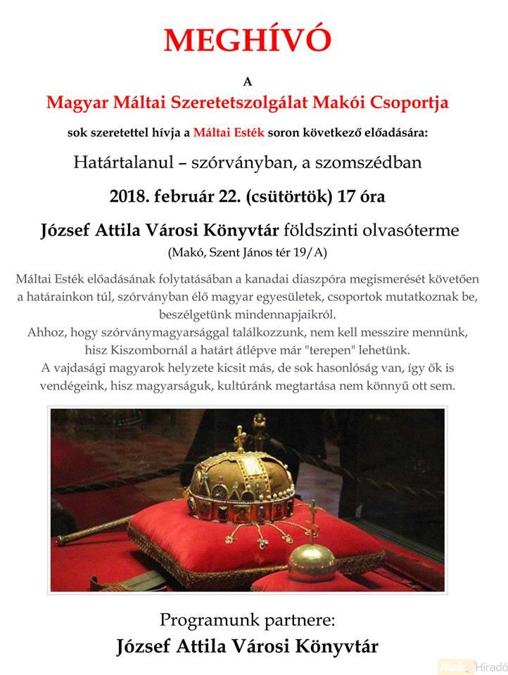 A határon túli szórványmagyarságról szól a Máltai Szeretetszolgálat helyi csoportja csütörtöki, a József Attila Városi Könyvtárban kezdődő estje. Ez alkalommal két romániai és egy szerbiai magyar település közössége(i) mutatkoznak be.