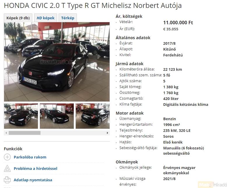 „Ha szeretnéd átérezni az igazi Type R érzést akkor itt a lehetőség. Téli nyári alufelni garnitúrával, és Michelisz Norbert aláírásával azonnal elvihető.” – írja az a hirdetés, amelyen online is megtekinthető Michelisz Norbert egykori Hondája.
