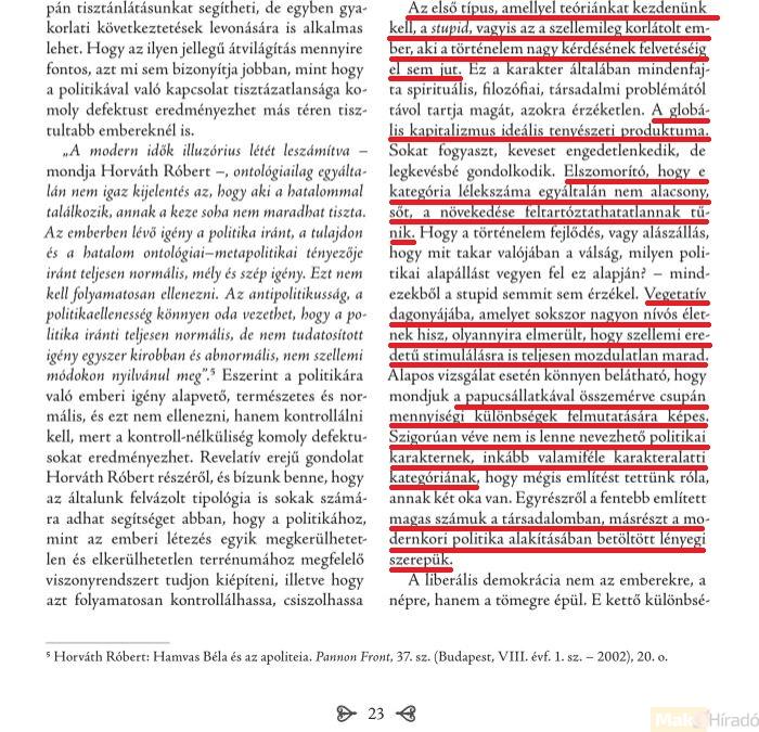 Vona mindehhez hozzáteszi: ez a csoport inkább valamiféle karakteralatti kategória, ám a modernkori politika alakításában lényegi szerepet töltenek be. A következő, 24. oldalon még jobban belemelegedik a szerinte „hülye” emberek gyalázásába, tudományos mázzal nyakon öntött ócsárlásába.