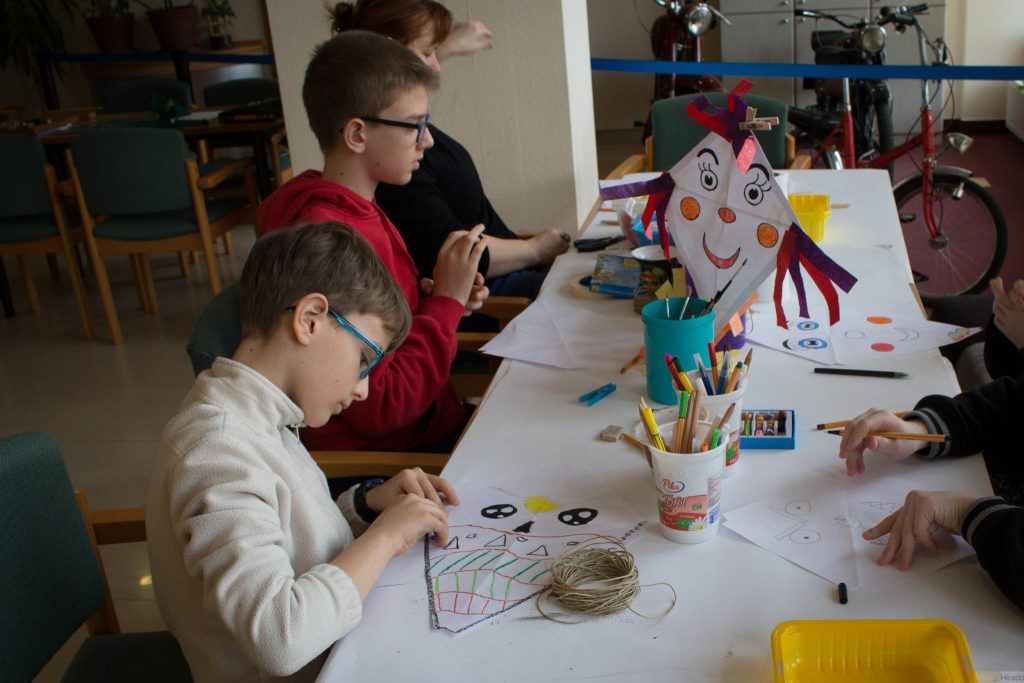 A Hagymaházban tartott családi délelőtt után a nagyobbak az Ifjúsági Színtérben készíthettek papírsárkányokat. A bohócarc helyett volt, aki a görög mitológia jelképeivel díszítette alkotását.