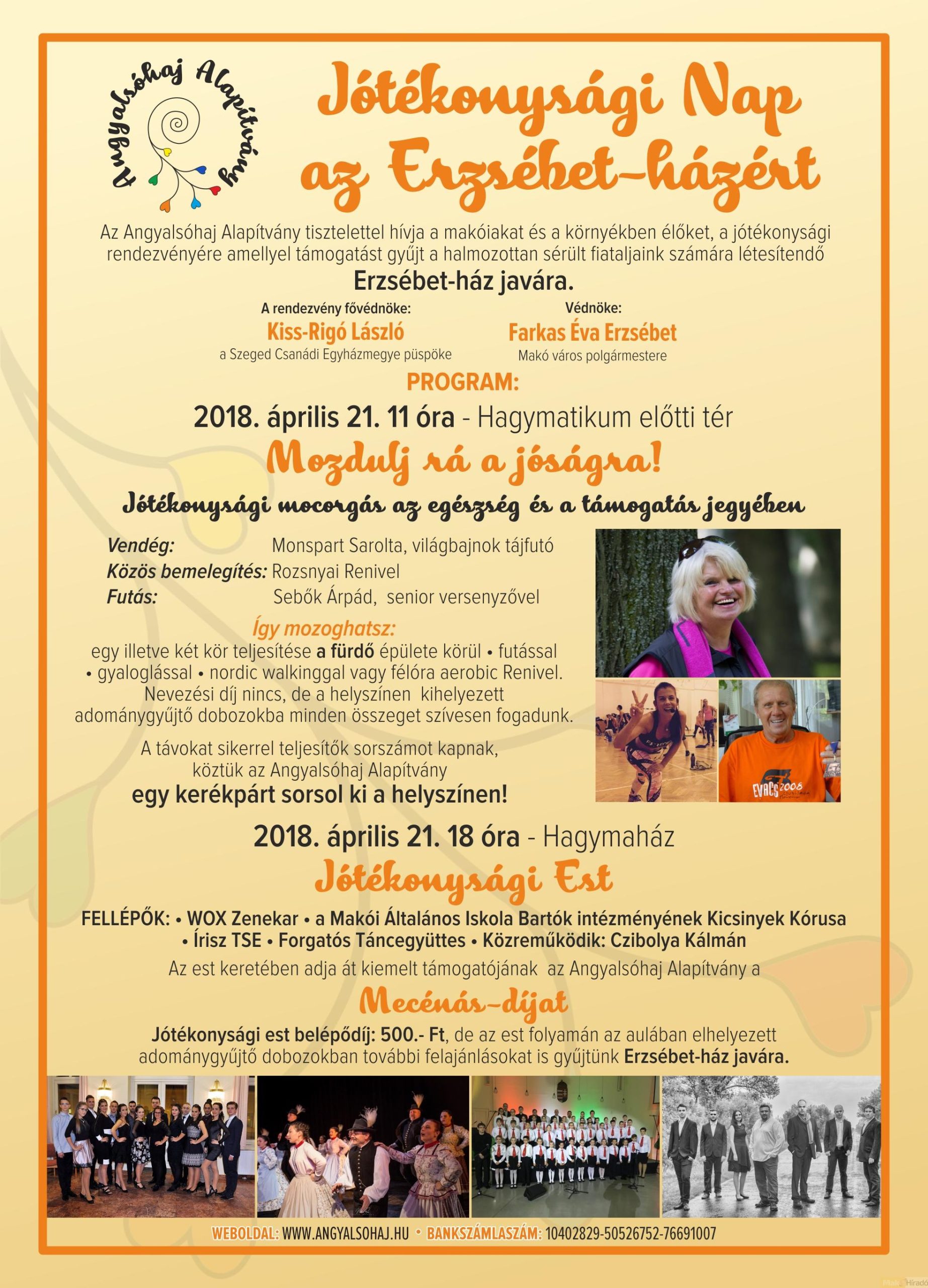 Az Angyalsóhaj Alapítvány jótékonysági rendezvényt szervez a halmozottan sérült fiatalok számára létesítendő Erzsébet-ház javára. Április 21-én, 11 órakor a Hagymatikumnál várják az érdeklődőket, hogy közösen mozogjanak a jó cél érdekében, 18 órától pedig Jótékonysági Estet tartanak, ahol többek között fellép a WOX Zenekar és az Írisz TSE is. Az esten átadják a Mecénás-díjat is.