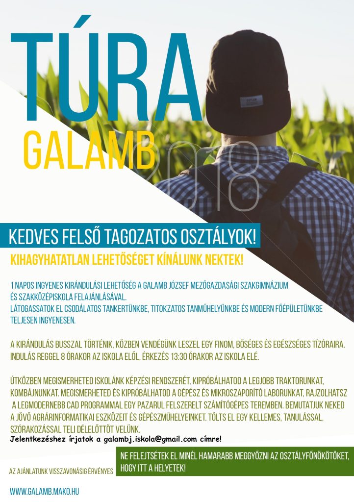 Egynapos ingyenes kirándulásra invitálja a felső tagozatos osztályokat a Galamb József Mezőgazdasági Szakgimnázium és Szakközépiskola: a utazás során a diákok megismerhetik az iskola tankertjét, tanműhelyét és modern főépületét is. Jelenleg 9 iskola jelezte részvételi szándékát Mórahalomról, Hódmezővásárhelyről, Pitvarosról és Békéscsabáról. A lefoglalható helyek gyorsan telnek, ezért az iskola úgy döntött, hogy szeptembertől is folytatják a kezdeményezést.