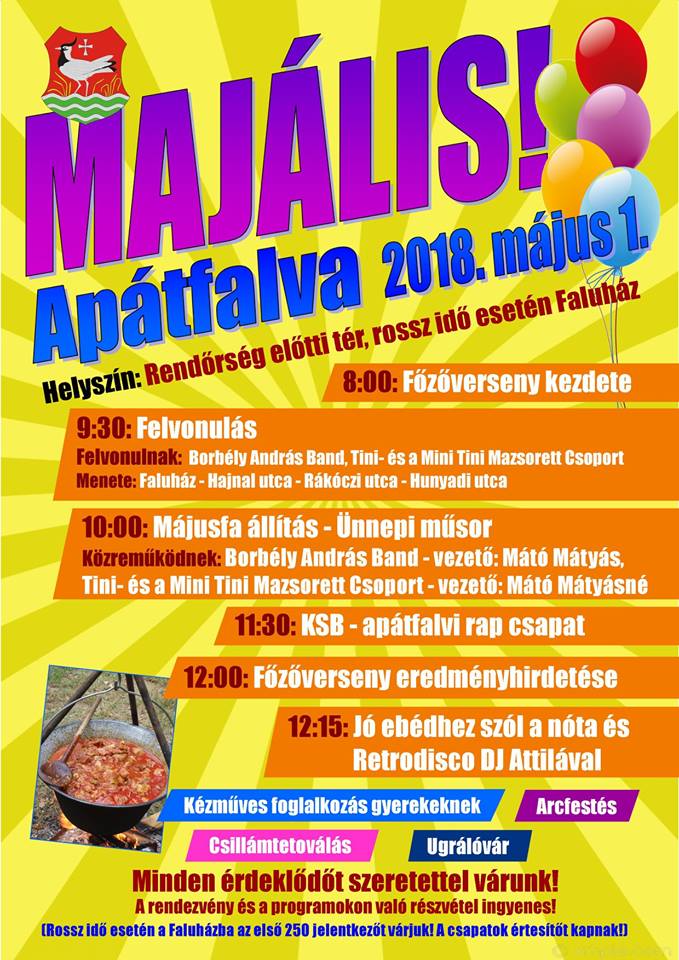 Bár már 8-kor elstartol a  főzőverseny, a majális igazi része a fél 10-kor kezdődő felvonulással kezdődik. Még májusfát is állítanak.