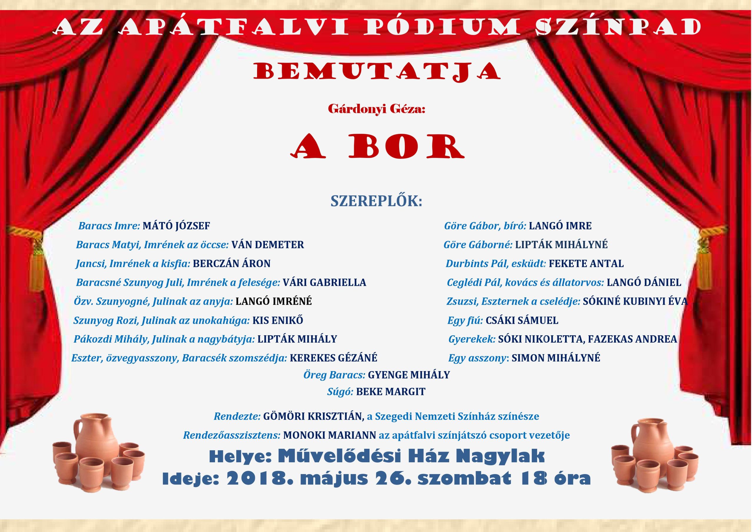 Az apátfalvi Pódium Színpad a nagylaki Művelődési Házban lép fel május 26-án, szombaton „Gárdonyi Géza: A bor” című előadásával.