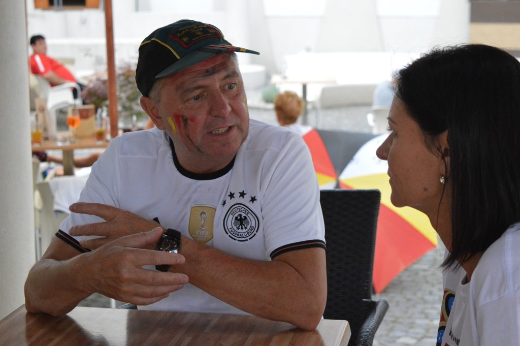 A berlini Jörg Wursach baráti társasággal érkezett a Nyugi Bár teraszára. Jörg jelenleg Bécsben él, de családja Makóhoz köti – így került a fociteraszra. A két félidő közti szünetben elmondta, a Nationalelfnek kicsit nehéz a helyzete, miután egy új felállásban játszik, de úgy véli, a csapat időről időre jobban fog játszani.