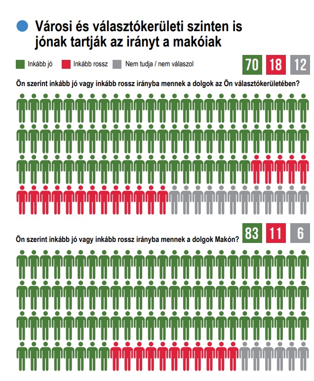 Az „Ön szerint inkább jó vagy inkább rossz irányba mennek a dolgok az Ön választókerületében?” kérdésre a megkérdezettek 70 százaléka  a jó irányt választotta, és 83 százalék Makón is pozitívként élte meg az elmúlt időszakot.
