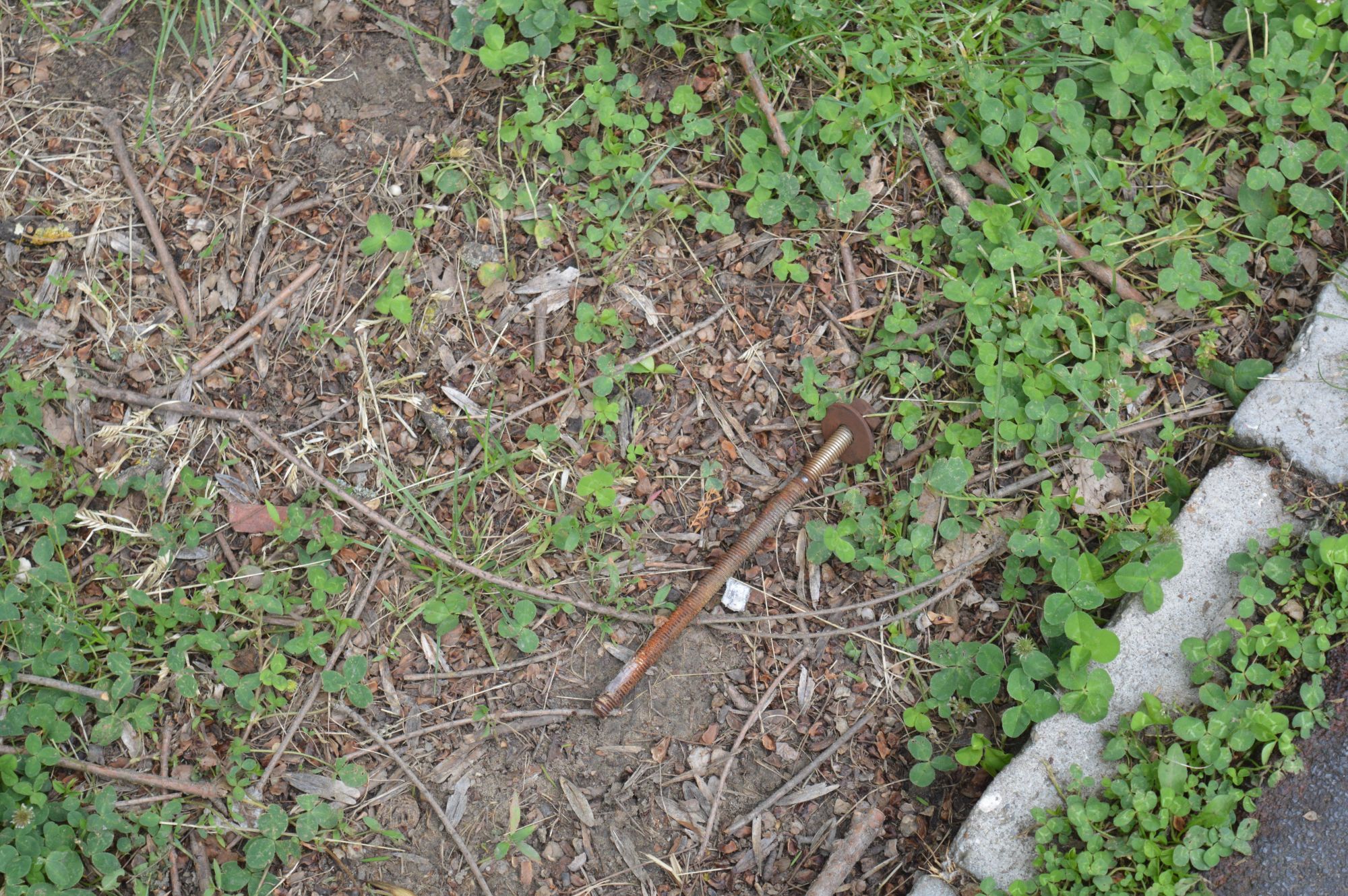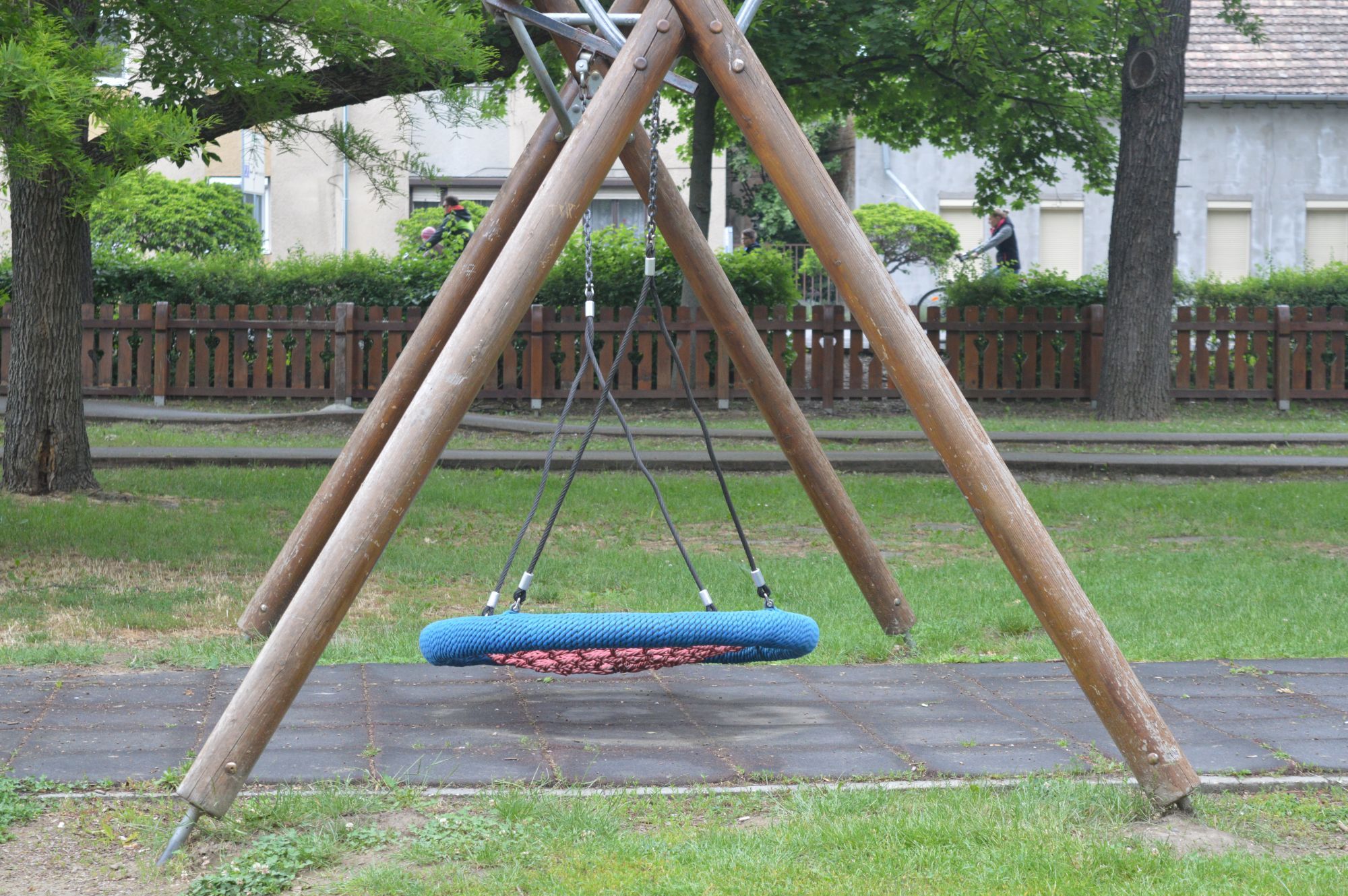 A nagy hálós hinta egyik fém tartójának hatalmas csavarja a földön fekszik, az egyik anyacsavarnak nyoma sincs. Nem tudjuk mi történt vele, de vagy megrongálták, vagy “nagy gyerekek” amortizálták le az eszközt.