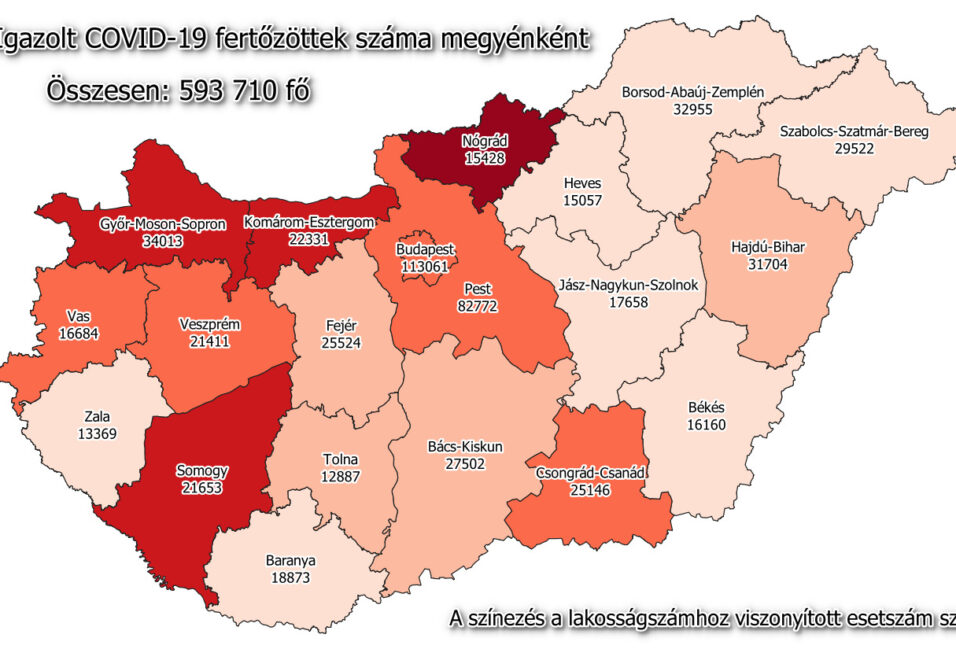A kormányzati portálon azt írták: 593 710-re nőtt a Magyarországon azonosított fertőzöttek száma. Az elhunytaké 18 952-re emelkedett, a gyógyultak száma 381 807.