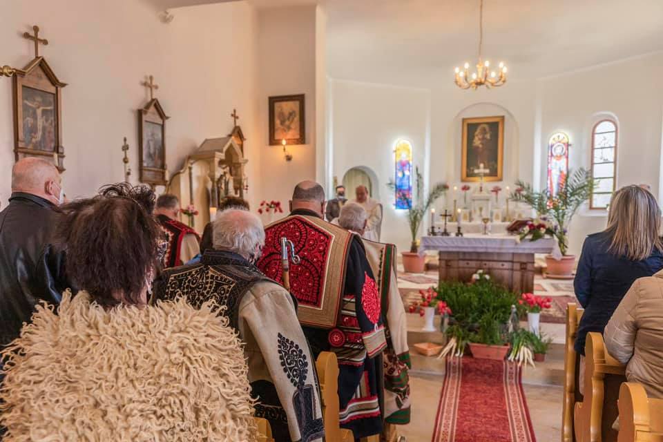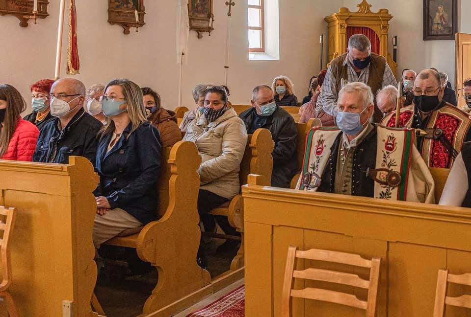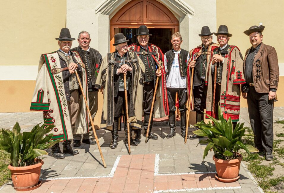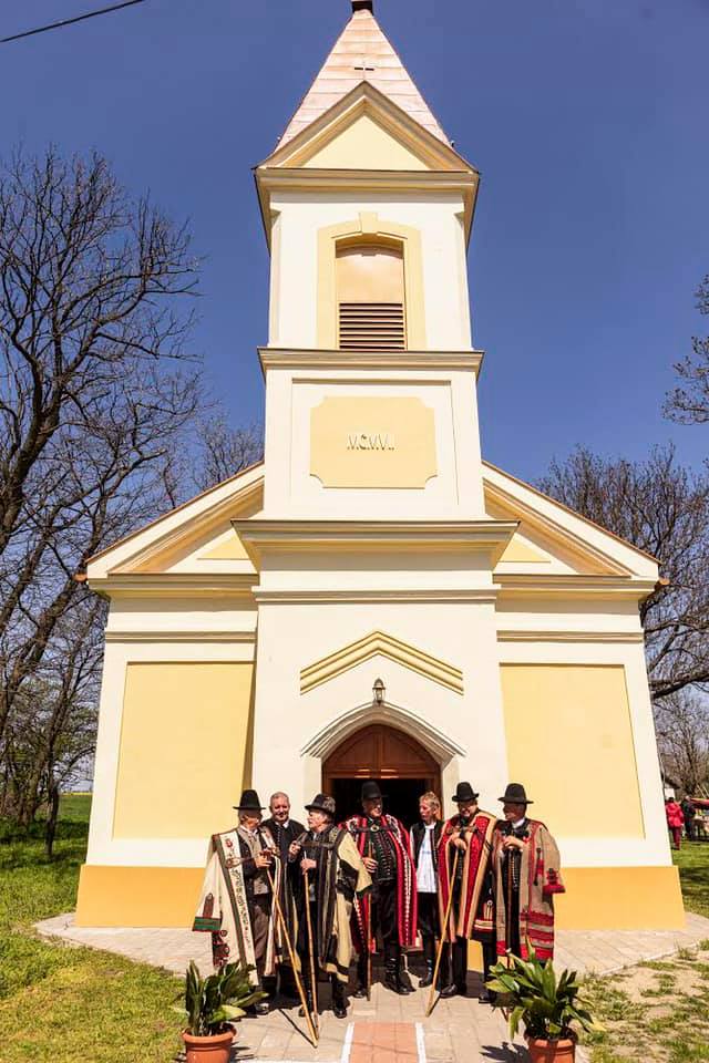 Fegyver Tibor, Dani János, Harangozó Imre, István Lajos, Kiss Miklós és társai az idei, rendhagyó Szent György napi rendezvényen, a magyar Népviselet Napján a makói bográzói templom előtt, mely korábban a környékbéli puszta központja volt, éppen fél éve újították fel.