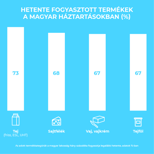 Ha azt nézzük, melyik az a termék, amelyet legalább hetente fogyasztanak a magyarok, első helyen a tej áll, amelyet a lakosság közel háromnegyede, a megkérdezettek 73%-a iszik minden héten legalább egyszer. A válaszdók kétharmada pedig legalább heti egyszer eszik sajtot (68%), vajat, vajkrémet vagy tejfölt (67%).