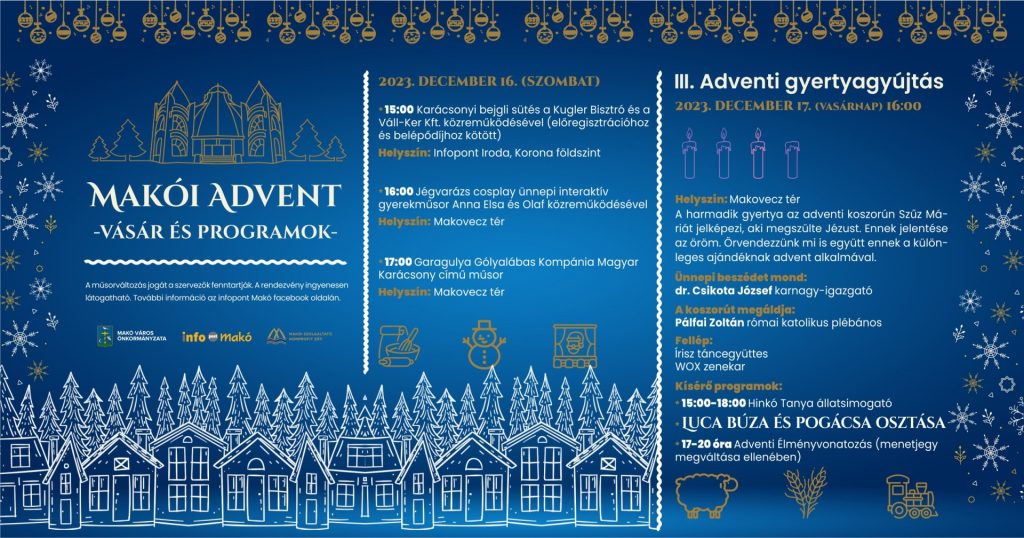 Holnap délután 4 órától várják az ünnepelni vágyókat a makói Makovecz téren. Farkas Éva Erzsébet polgármester a Rádió 7-nek arról számolt be: a harmadik gyertyagyújtáson is helyi művészeti csoportok, együttesek mutatkoznak be. Az eseményen a jelenlévőknek – a régi hagyományok szerint – Luca-búzát, illetve pogácsát osztanak. A polgármester hozzátette: a korábbi évekhez képest kibővítették az adventi városi rendezvényeket.