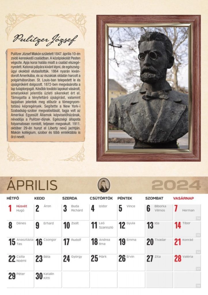 Páger Antal, Pulitzer József mellett a naptárban olvasni lehet még Szakáts Gáborról vagy Eckhardt Tiborról is. Az elnök hozzátette: már megszületett a 2025-ös naptár tematikája is.